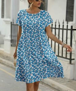 Deals π Pink Daisy Blue & Beige Floral Short-Sleeve Empire-Waist Shift π Dress – Plus π