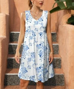 Deals β Pink Daisy White & Blue Floral Sleeveless V-Neck Empire-Waist π Dress – π© Women π