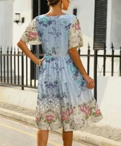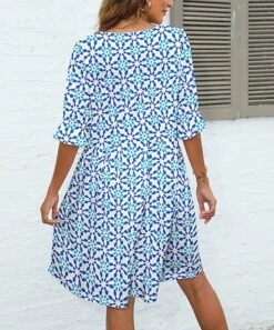 Discount 𧨠Pink Daisy Blue & Beige Geo Floral Tiered V-Neck A-Line π Dress – Plus π§¨