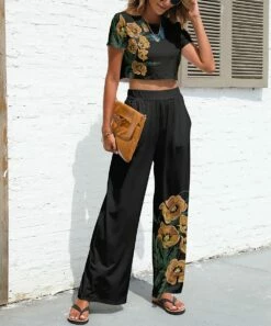 Cheap 👏 Pink Daisy Black Floral Crop Top & Wide-Leg Pants – 👩 Women 🤩