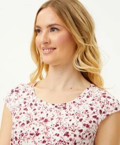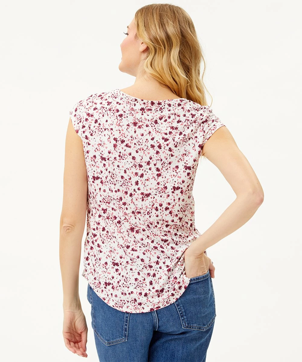 Stretch-enhanced top featuring subtle cap sleeves and a floral print.