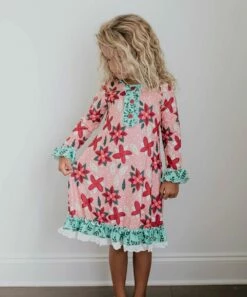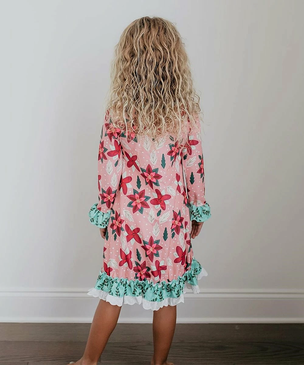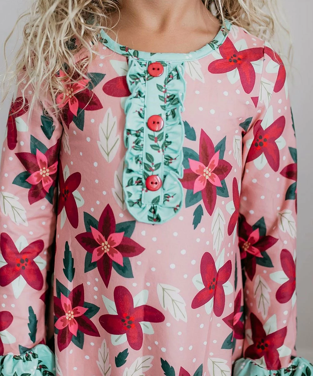 Sweeten your little one’s style with this long-sleeve dress featuring a ruffled hem and button-front details. Poinsettia floral patterns add to their look.