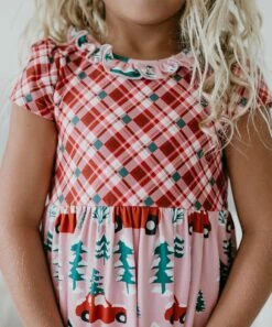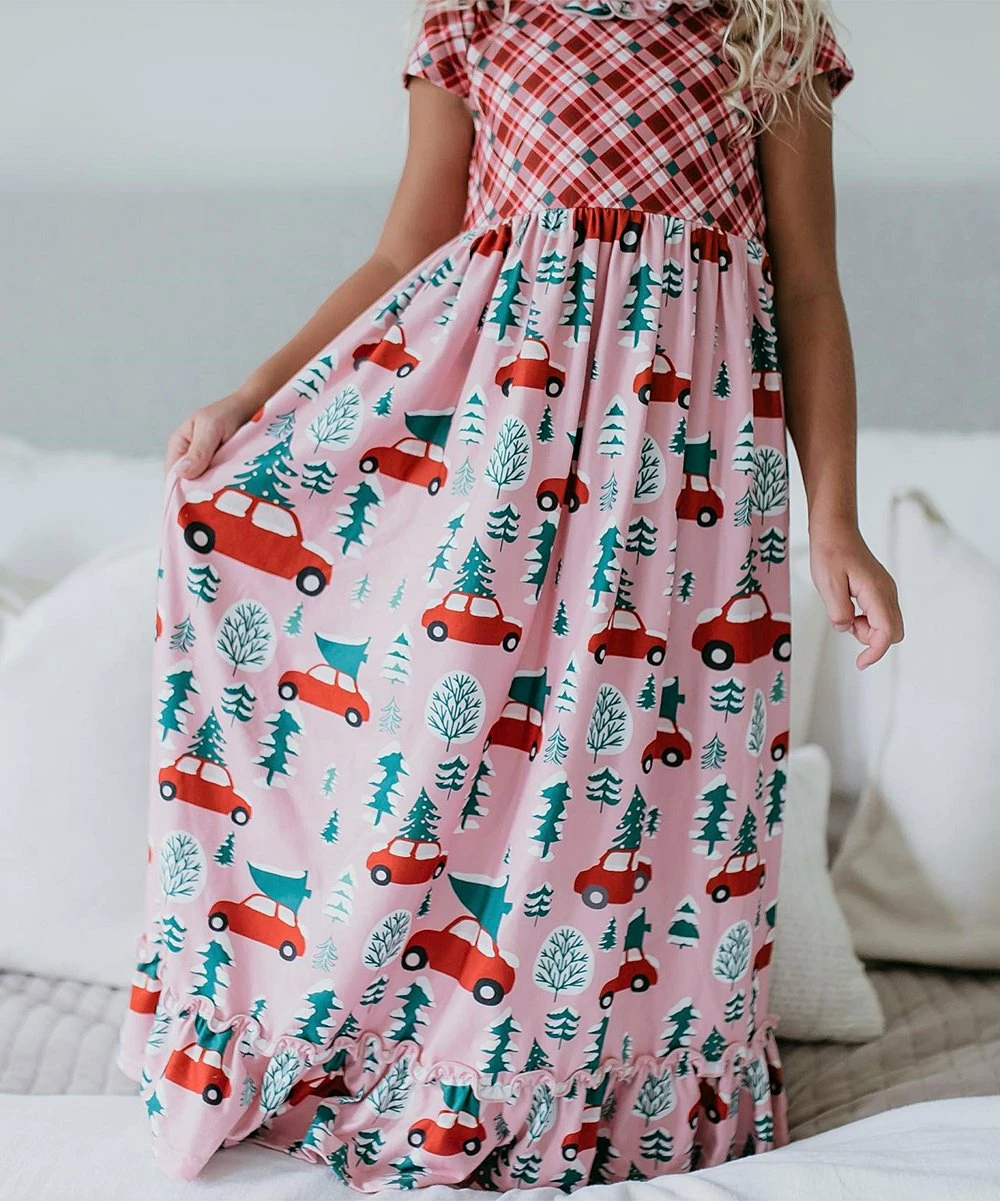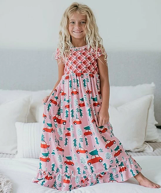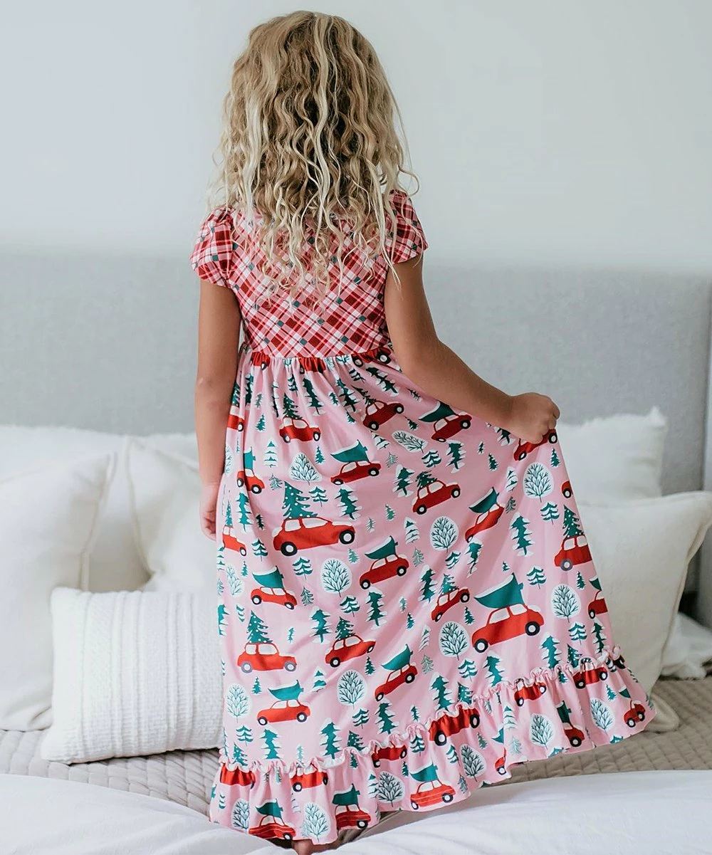 Sweeten your little one’s style with this cap-sleeve dress featuring ruffle details along hem and neckline. A pattern of cars carrying trees add to their look.