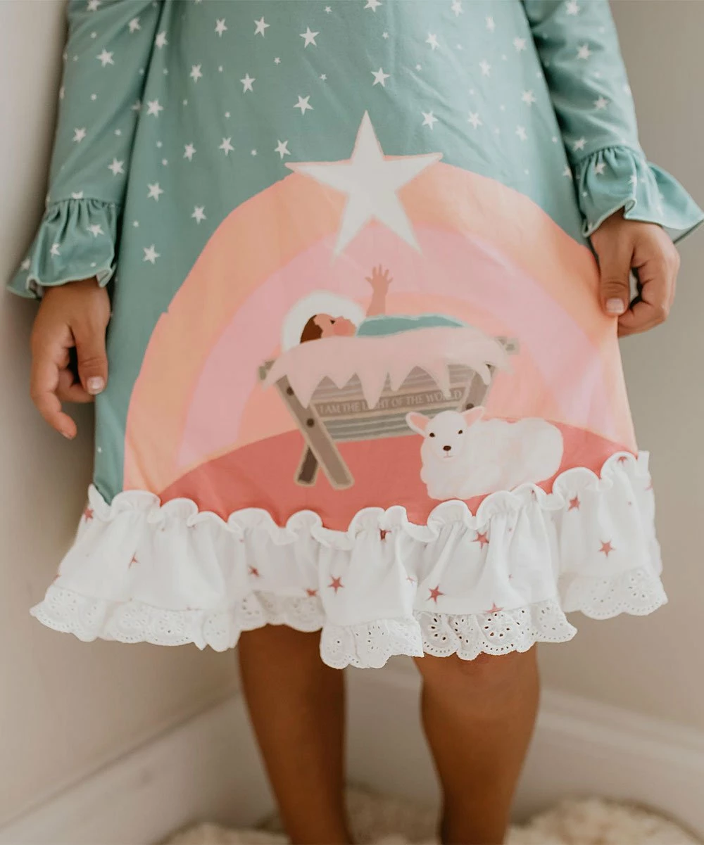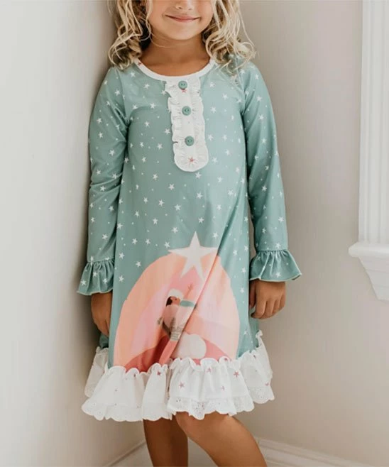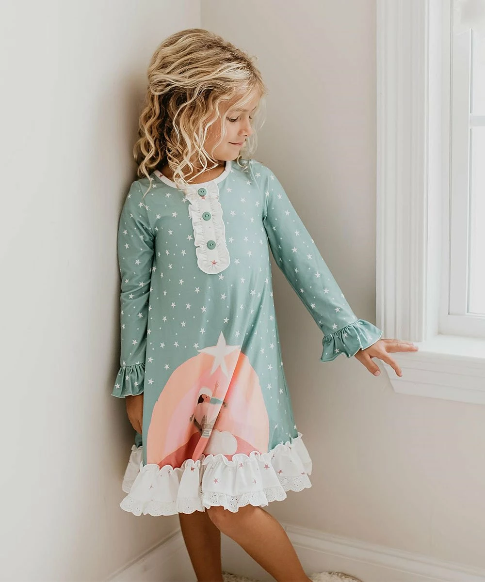 Sweeten their style with this nightgown featuring a ruffled hem, button-front details, star print and nativity graphic.