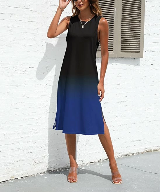 Enjoy the cool sleeveless cut of this midi dress featuring stretch-enhanced fabric and a slit at the hem for extra flexibility.