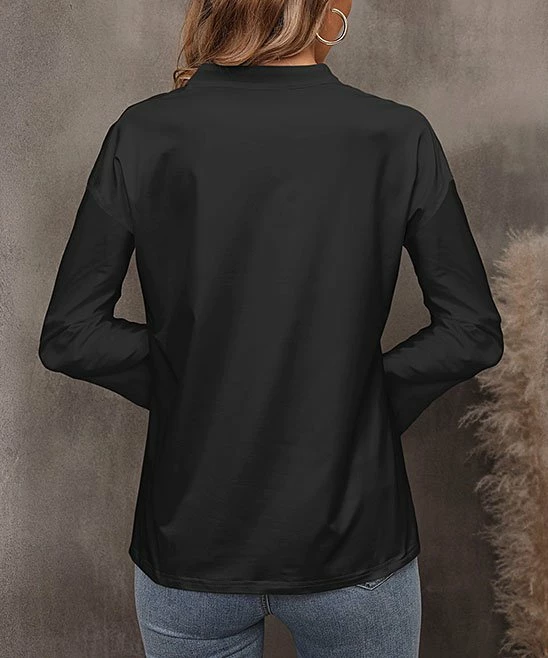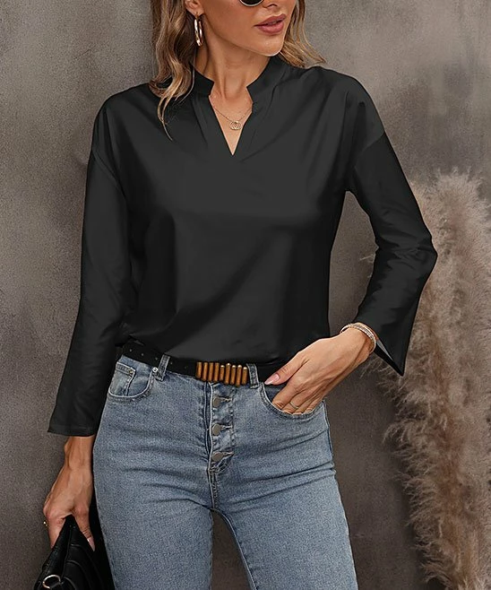 There’s a sporty attitude in this notch neck top with its versatile hue.