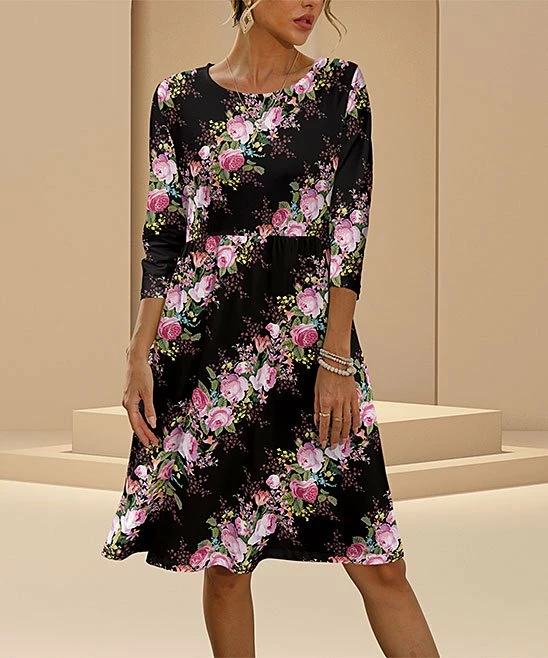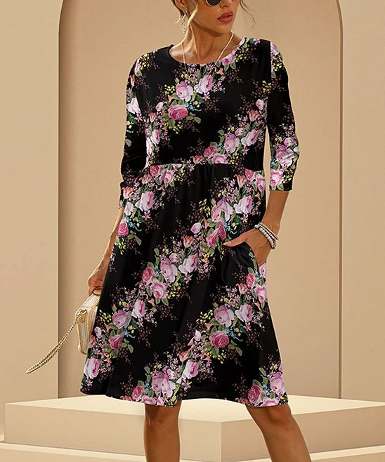 Flowy A-line dress featuring a floral pattern, three-quarter sleeves and handy side pockets.