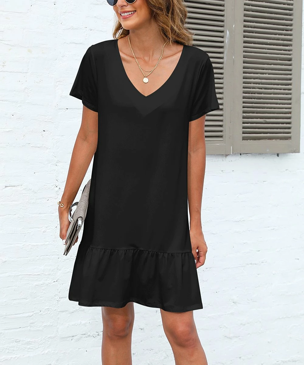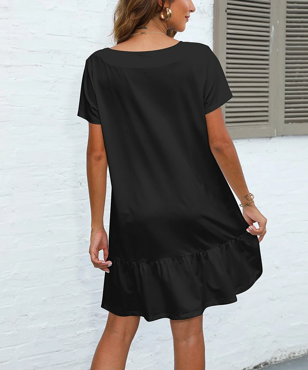 Minimalist short-sleeve dress featuring brushed fabric in a solid hue and ruffled drop hem.