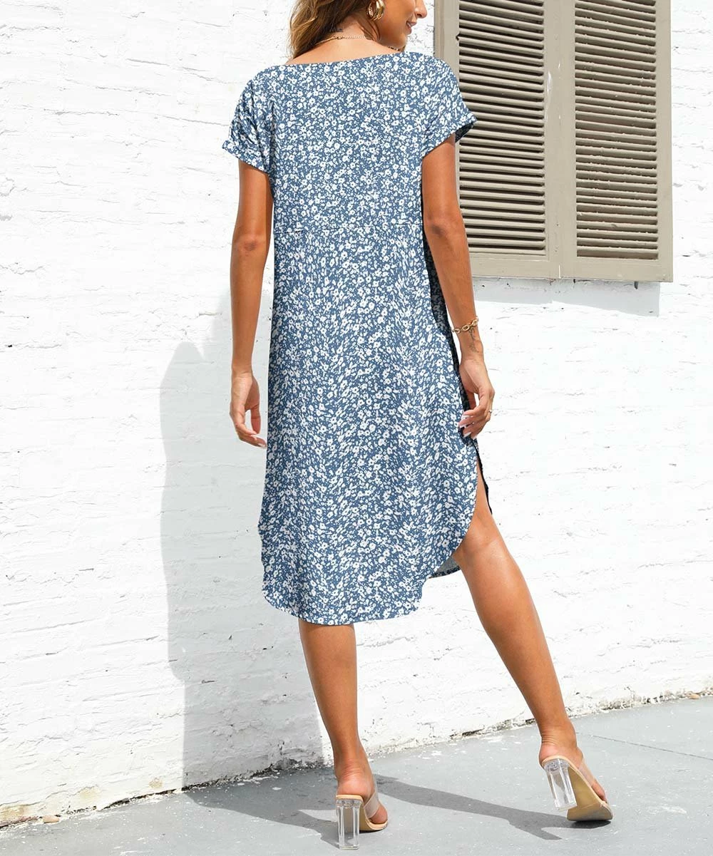 Short-sleeve empire waist dress with a curved hem for a flowy finish. Decorated with a floral pattern.
