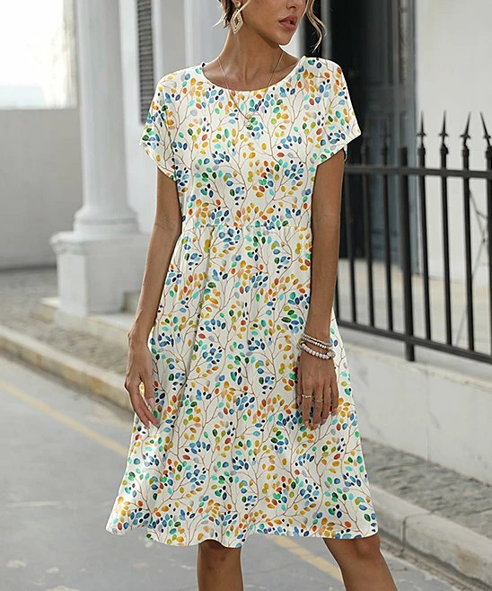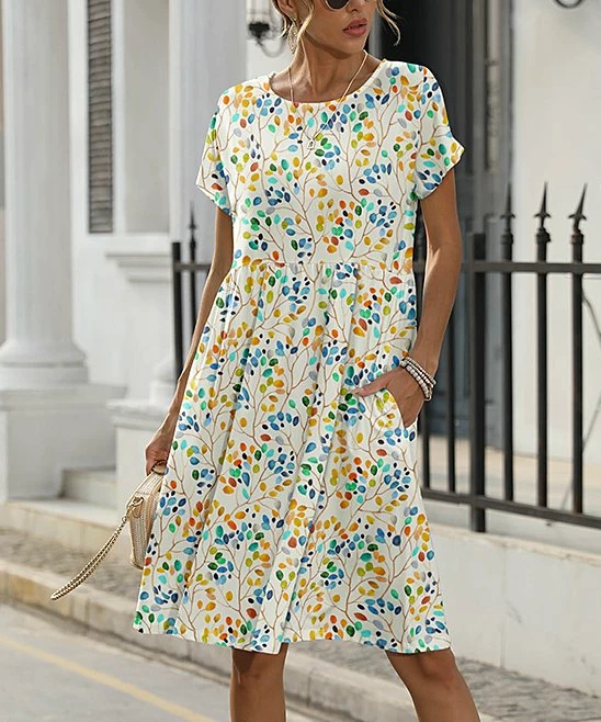 A short-sleeve shift dress donning a colorful botanical print and a flowy empire waistline. Finished with functional side-hit pockets.