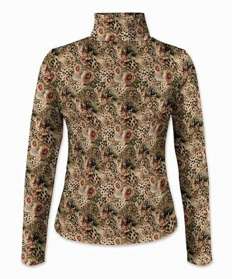 This top features an eye-catching graphic and a turtleneck design. Stretch-enhanced blend for flexible comfort.