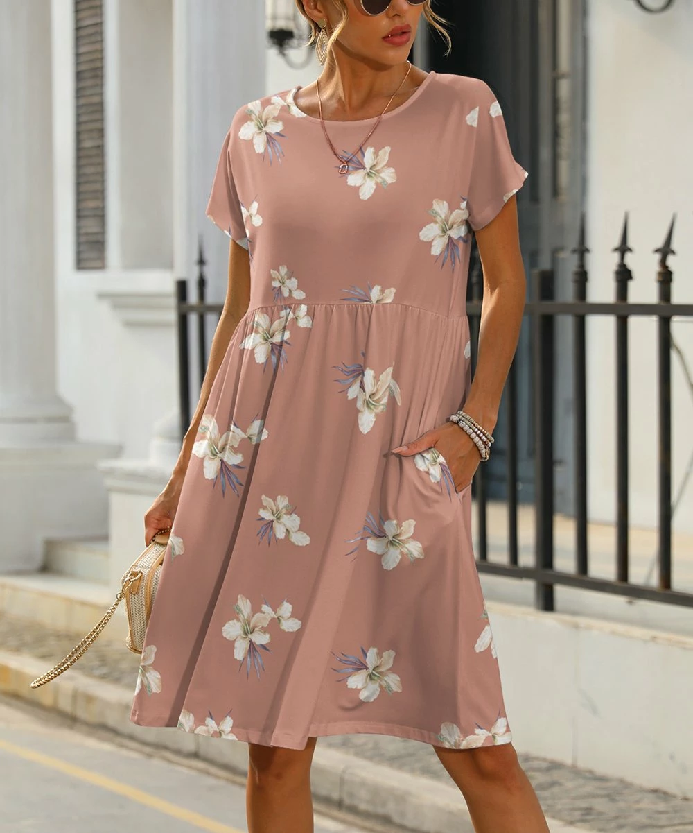 A-line dress featuring an elegant floral print and comfortable stretch-infused fabric.