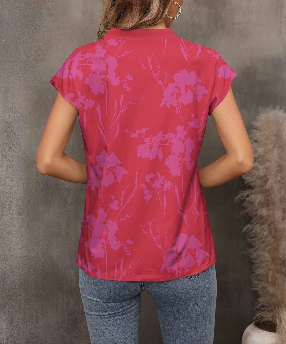 Notch neck top featuring elegant cap sleeves and stretch-infused fabric.