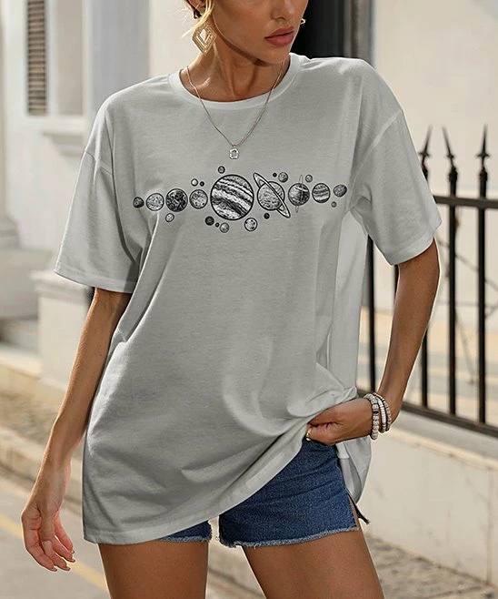 This oversize planet tee features lightweight, stretch-enhanced material for comfort throughout your busy day.