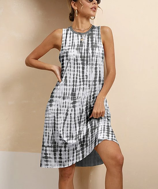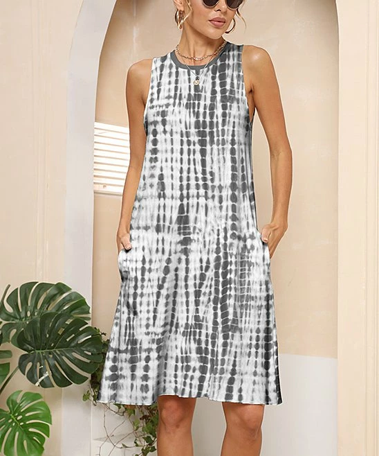 Bring a pop of print to your closet with this abstract-patterned sleeveless shift dress.