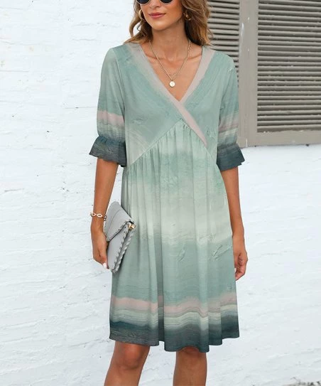 Half flutter sleeves add a pretty touch to this v-neck empire-waist dress made with a hint of stretch.