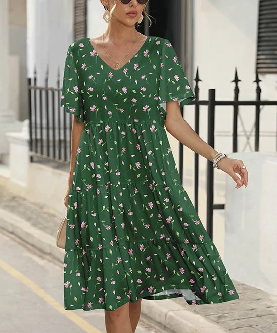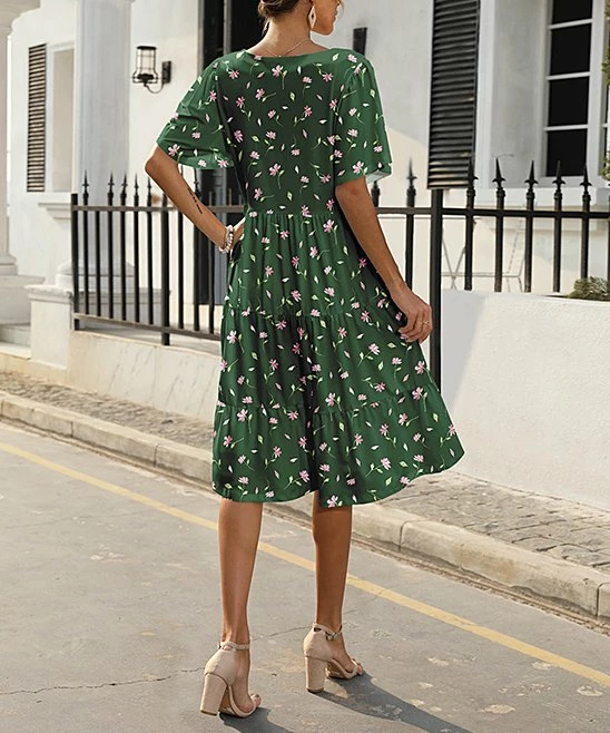 Great for warmer days, this tiered A-line dress boasts a colorful print with a classic v-neckline, playful butterfly sleeves and soft, stretchy material.