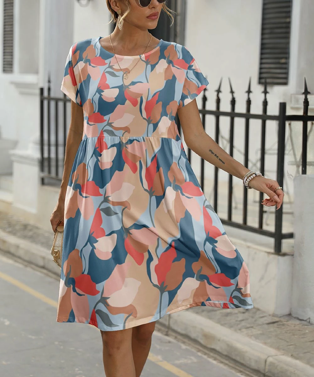 Stretchy material, convenient pockets and a colorful all-over print make this short-sleeve shift dress a warm-weather essential.