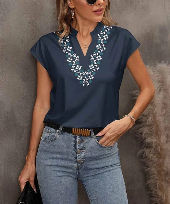 Enliven everyday style with this notch neck top featuring a statement pattern and cool short sleeves.