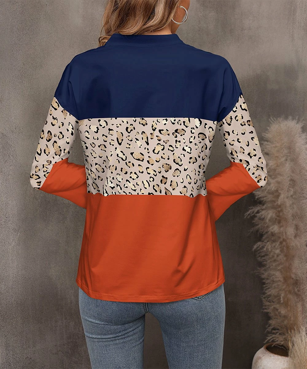 Notch neck top featuring a leopard color block design and stretch-infused fabric.