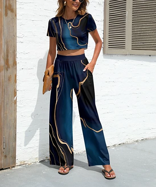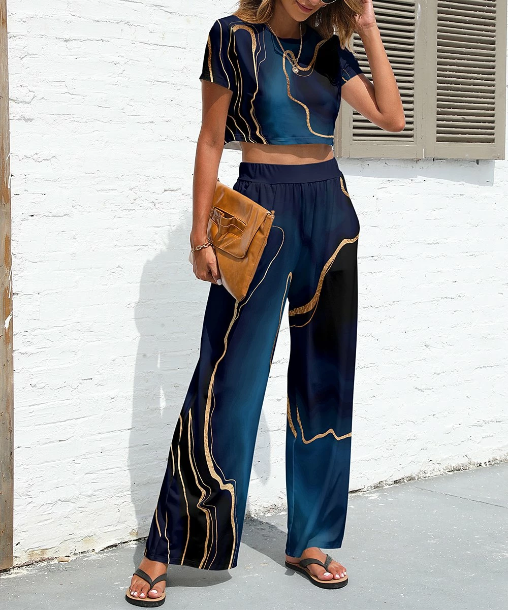 - Includes navy and yellow marbled crop tee and navy and yellow marbled pants (two pieces total)