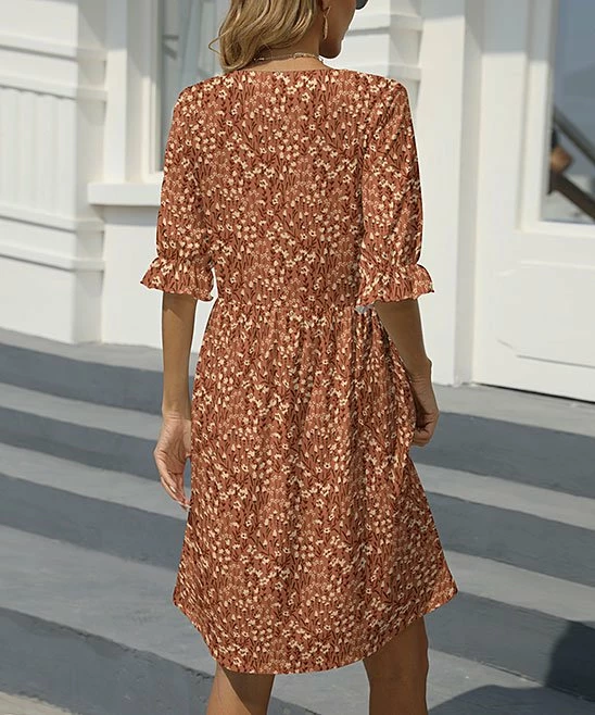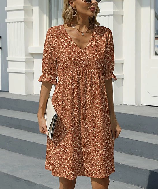 This lightweight A-line dress features a bold print, v-neck and short poet sleeves.