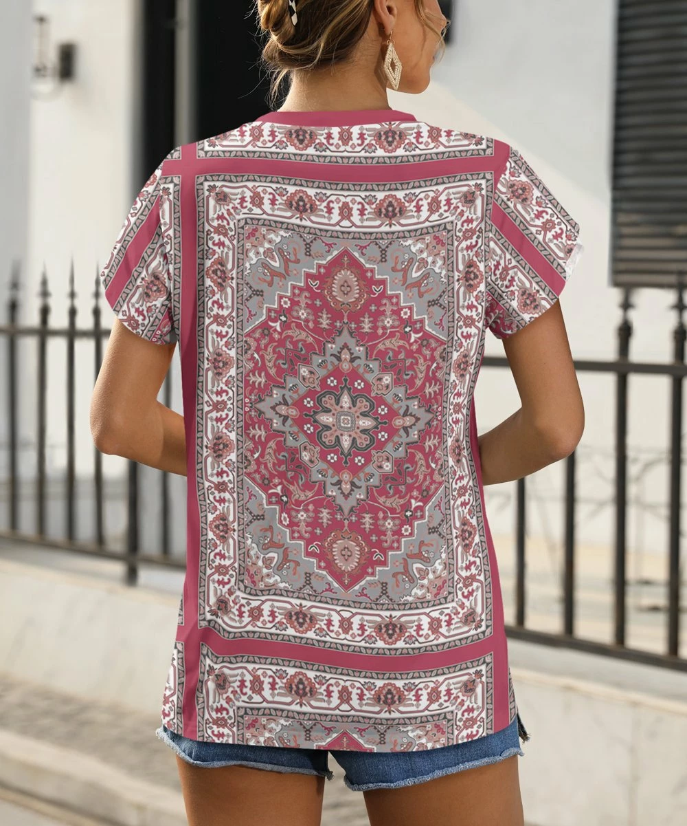 This stretch-infused v-neck tee is designed with a playful print and short sleeves.