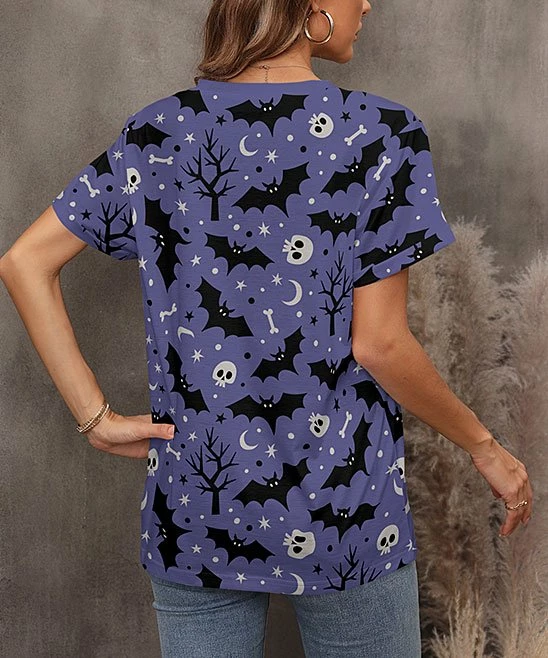 Get ready for spooky season with this v-neck tee featuring a little bit of stretch and a Halloween-theme graphic.