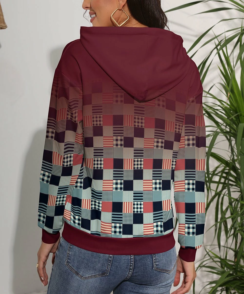 Bring a cozy staple to your casual collection with this hoodie that features an eye-catching patchwork design.