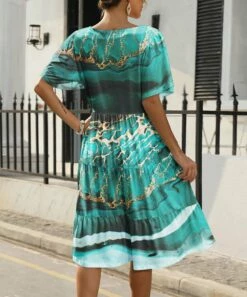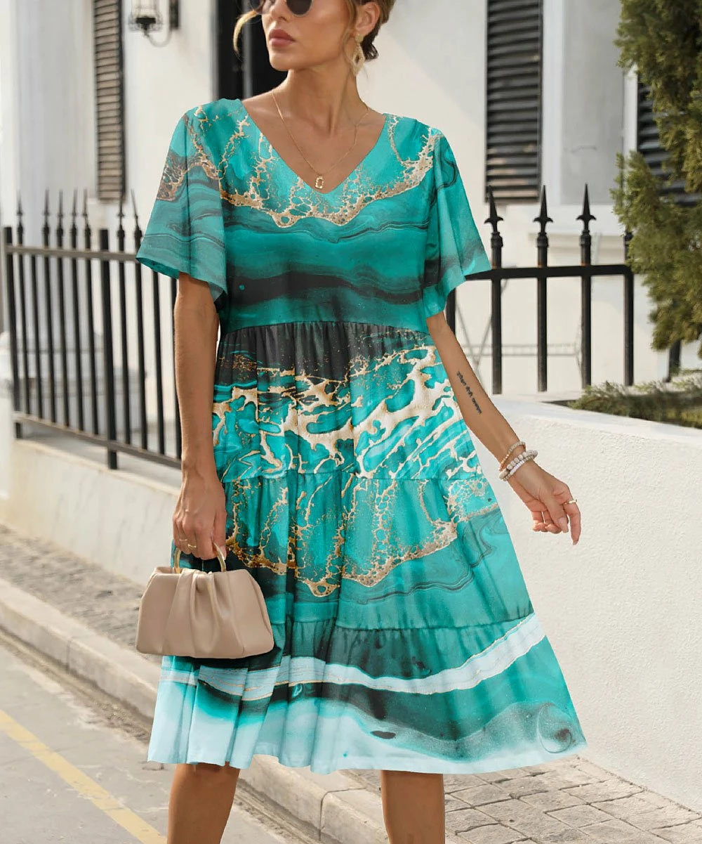 Breeze through the day in this lightweight A-line dress crafted with a bold pattern and flowy tiered skirt.