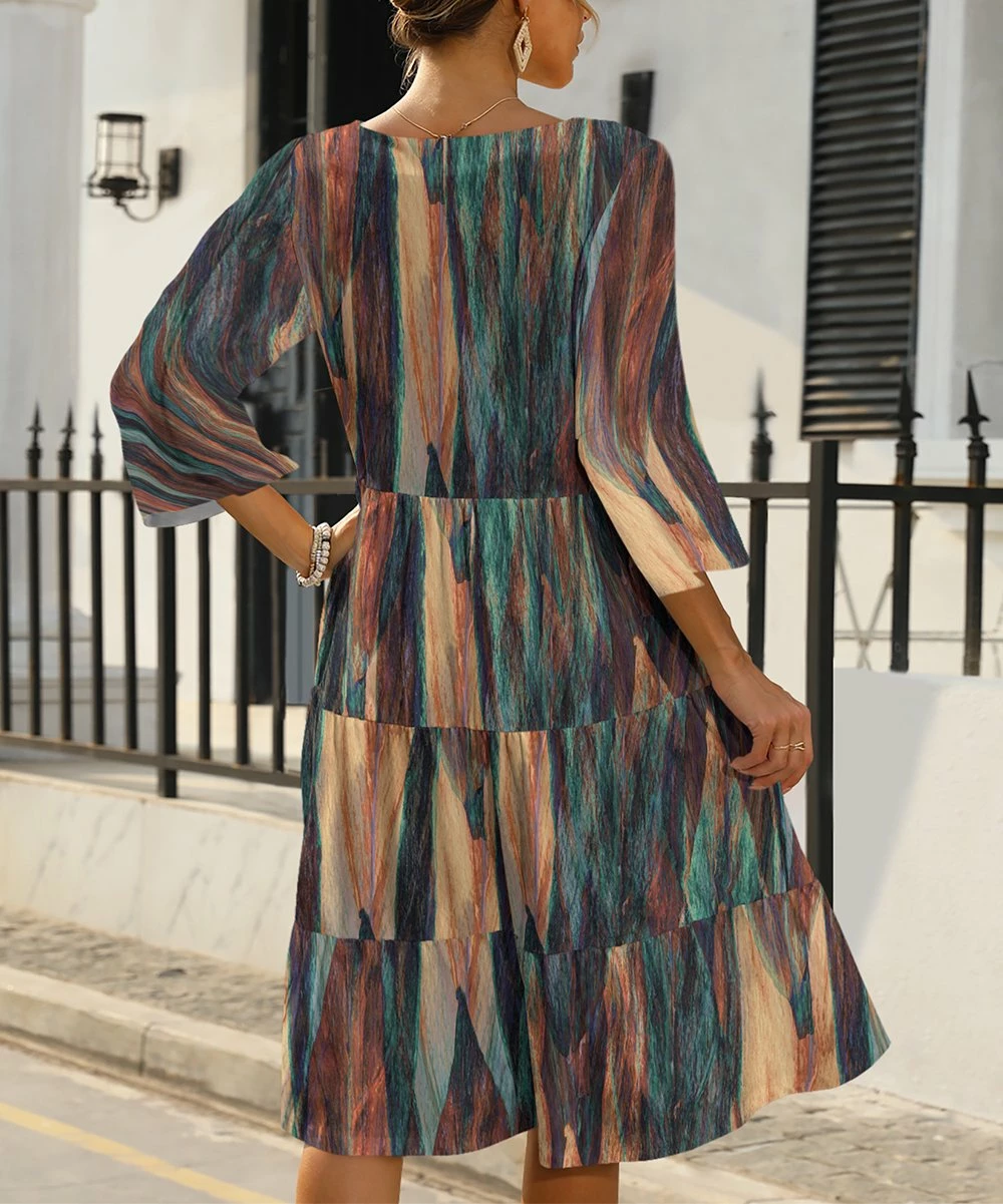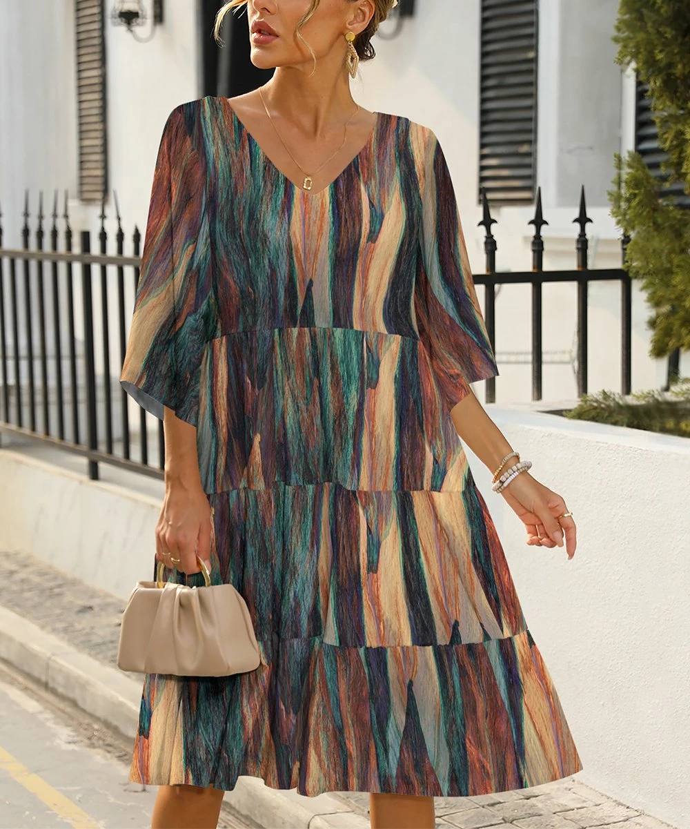 Add volume to your day with this tiered A-line dress boasting a flattering v-neck and three-quarter bell sleeves.