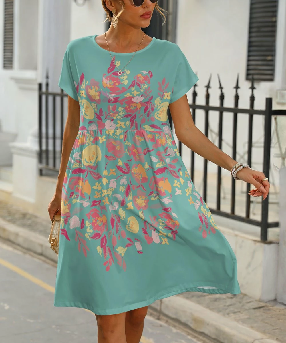 An A-line dress designed with a classic neckline and a vibrant floral print. Hidden side pockets.