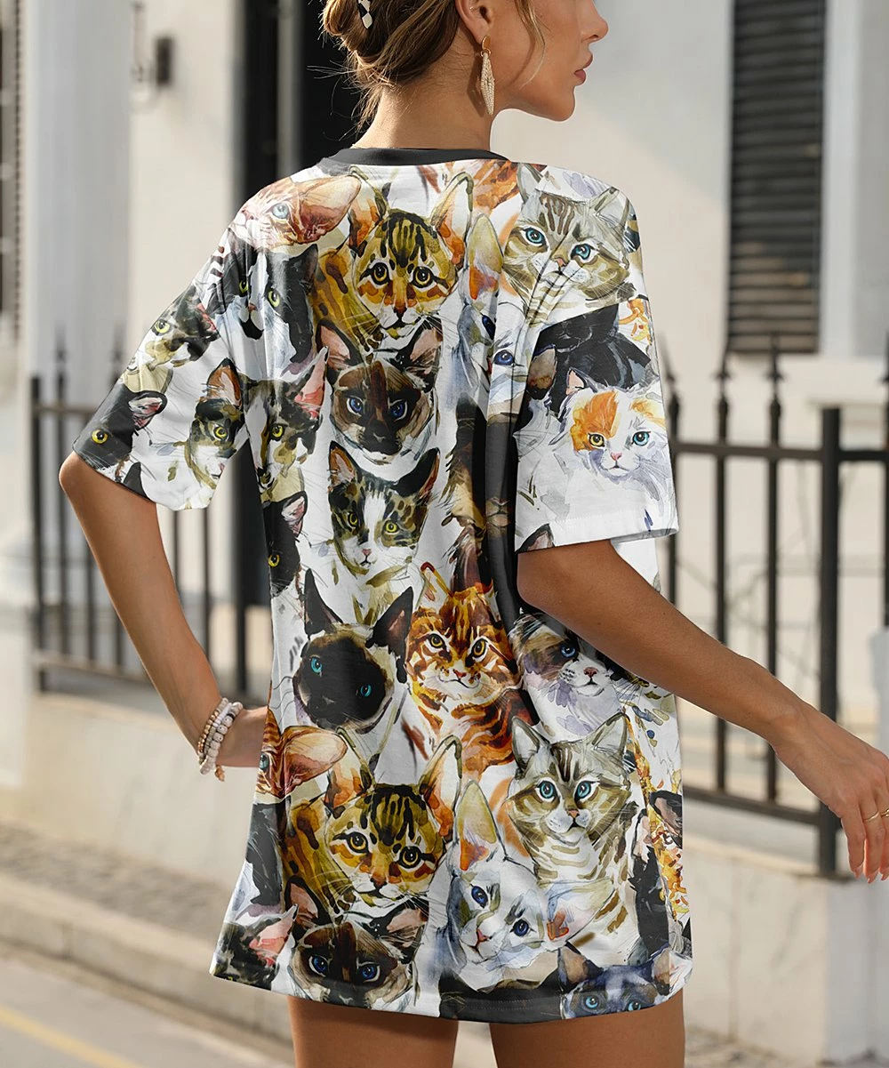 Revel in style with this roomy crewneck tee featuring a kitty collage graphic.