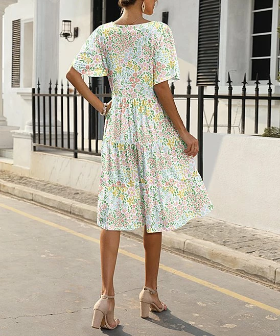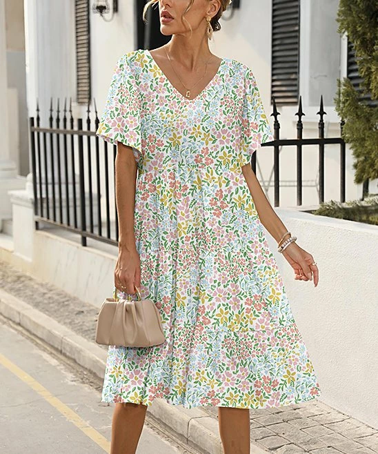 Budget β€οΈ Pink Daisy Blue & White Floral V-Neck Empire-Waist π Dress – π© Women & Plus π