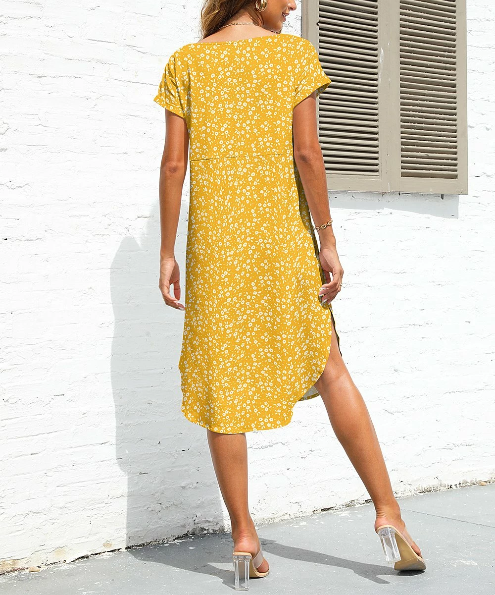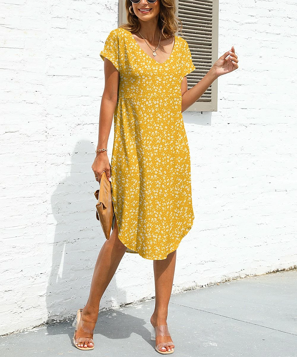 This lightweight A-line dress features a flattering v-neck, flowy curved hem and bold print.