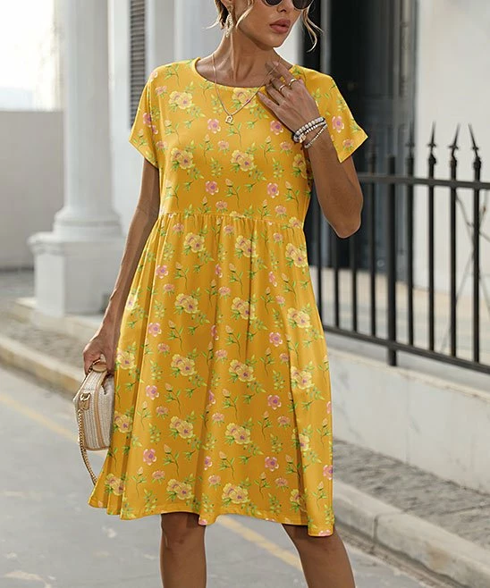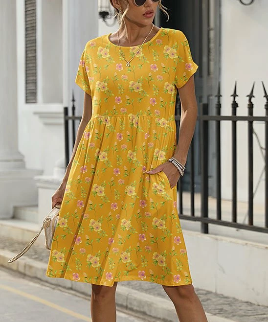This short-sleeve dress features a flattering A-line shape and convenient side pockets. Stretch-infused material ensures casual comfort.