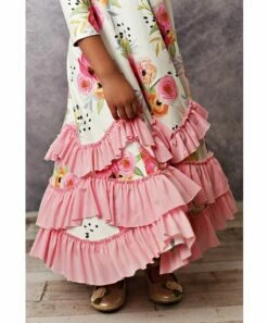 - Includes one gray and white stripe, one lavender and white floral, one pink and white stripe and one pink and white tulip dress (four pieces total)